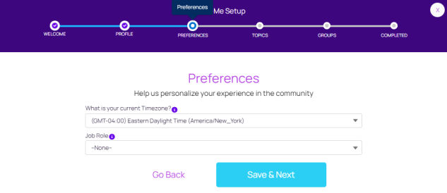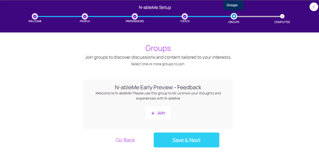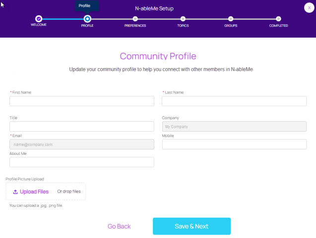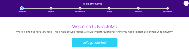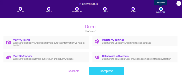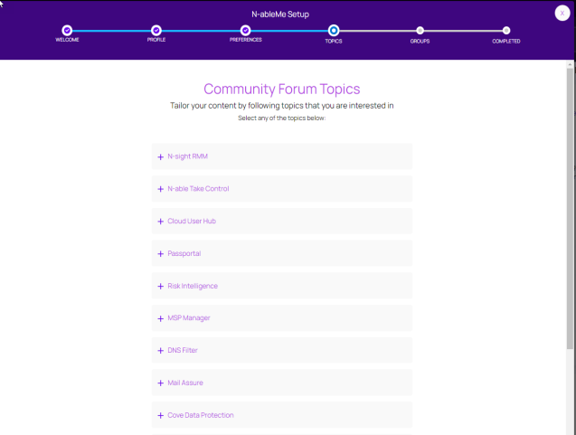 The N-ableMe Setup Guide leads you through the steps required to set up your community profile, preferences, topics of interest, and groups. You can update any step in the setup guide from MyProfile.