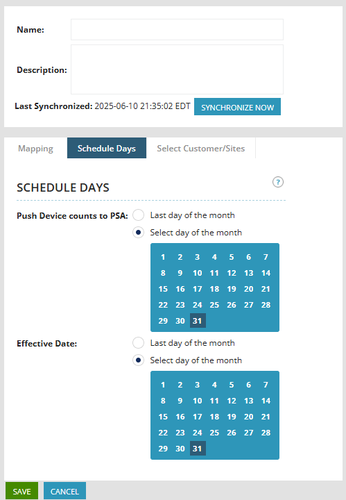 Push Device counts to PSA will be impacted by the dates you pick for Effective Date. Select all options in N-able N-central in a way that makes sense for your billing cycle.