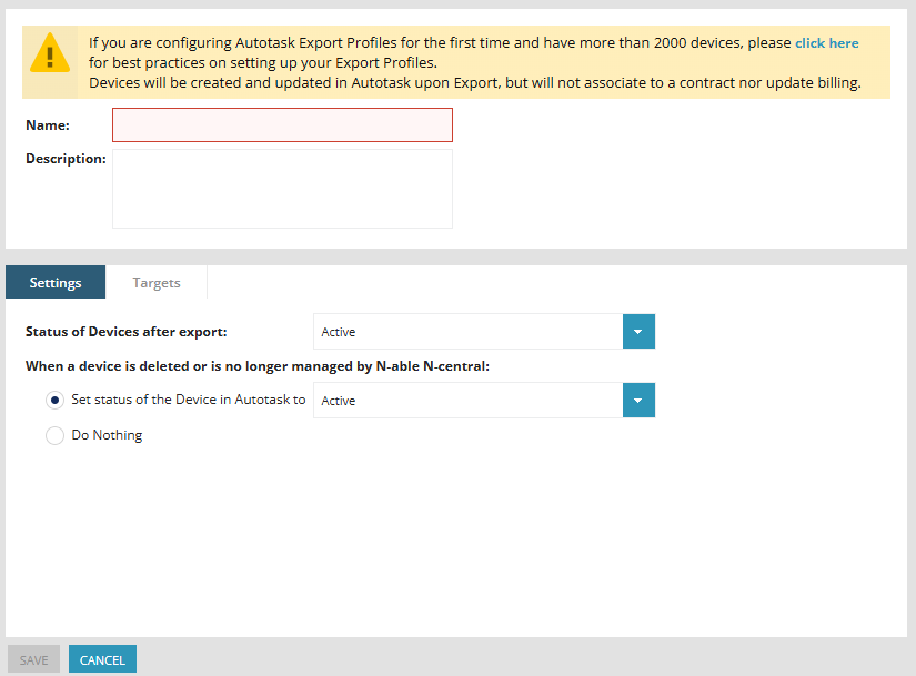 An Export Profile enables you to define settings and targets for device export. Once you set up an Export Profile, N-able N-central automatically exports device information to Autotask using the Export Profiles whenever a device change is detected.