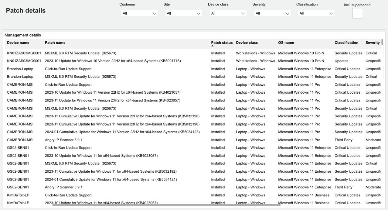 The Patch Details tab is dedicated to a table view of patches. You can filter the information the same way as other tabs to hone in on patch details. By default, the table is sorted by Patch Status and contains the following columns: Patch ID, Patch Name, KB Number, Patch Status, Patch Age, Classification, Patch Vendor, Severity, Patch Release Date, Approval Date, Superseded, Latest Status Change, Approval Time, Customer Name, Site Name, Device ID, Device Name, Device Class, and OS Name. The table includes a lot of information, making it easy for you to copy and adjust when you want tables dedicated to specific patch properties.