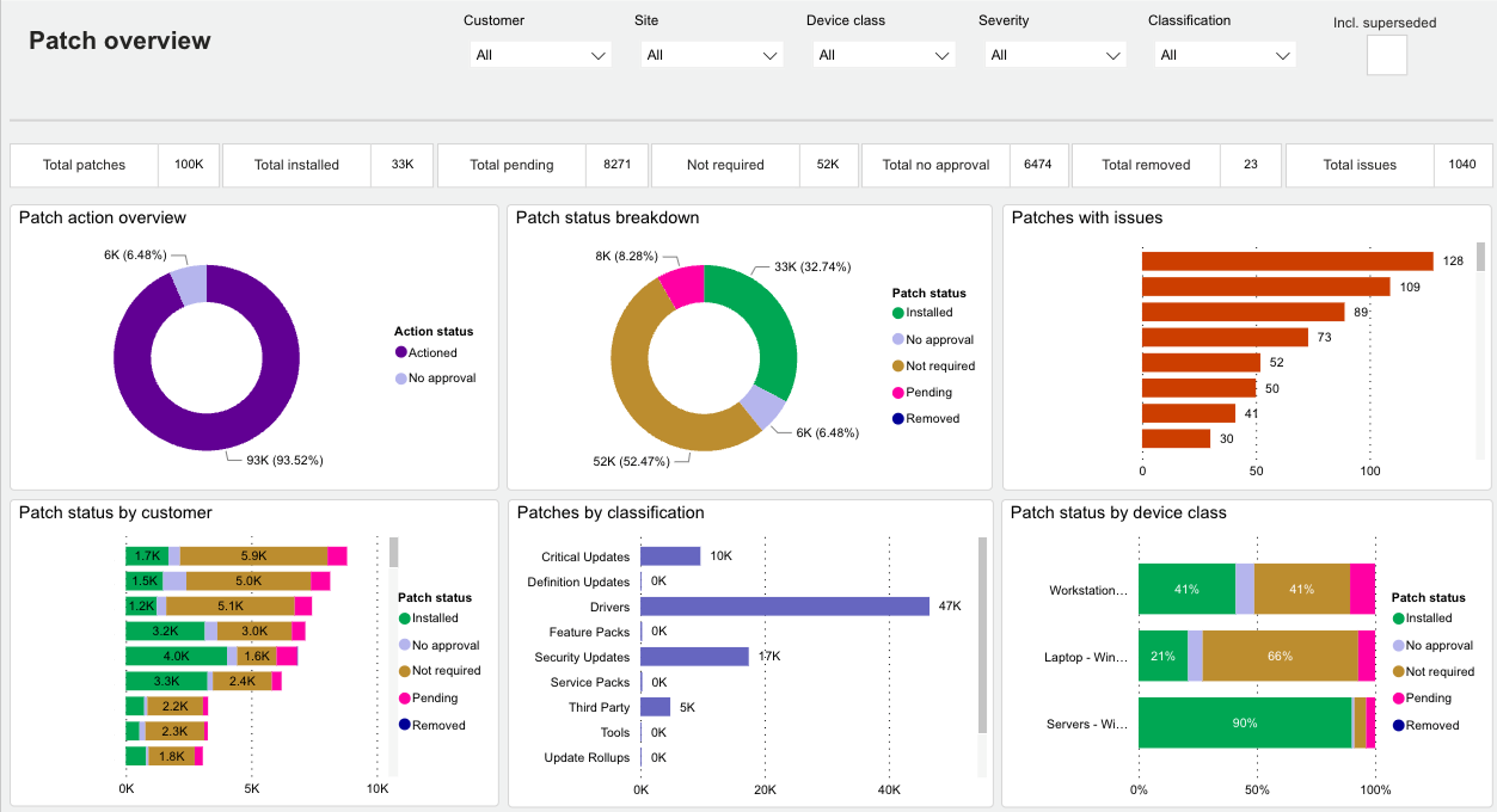 There are three more widgets to help you view patches from different angles, for example, by customer, classification, and device class. Finally, you can quickly discover in the Patches with issues widget, any patches that have issues to review, either failed to install or installed with errors.