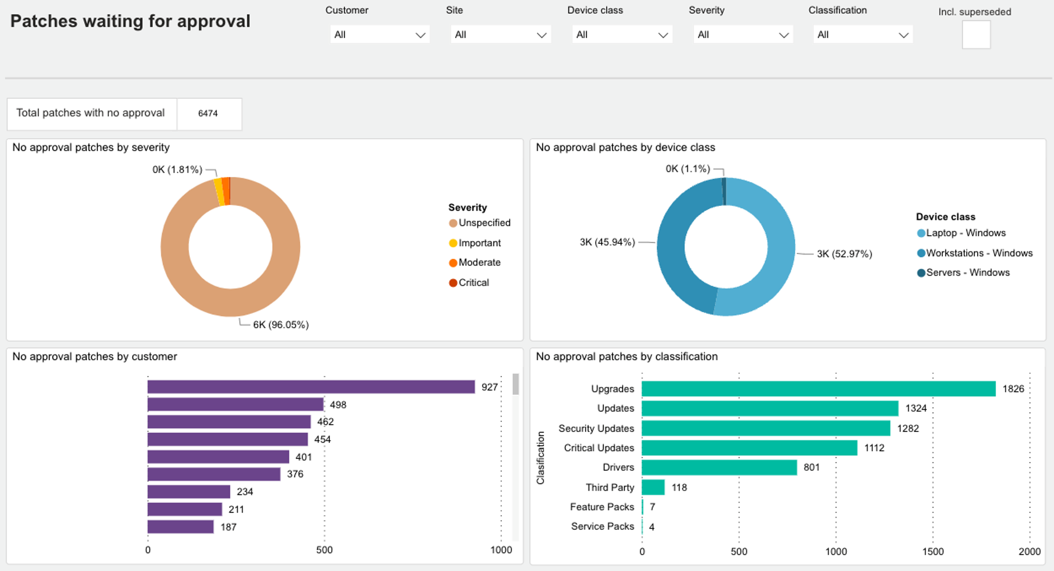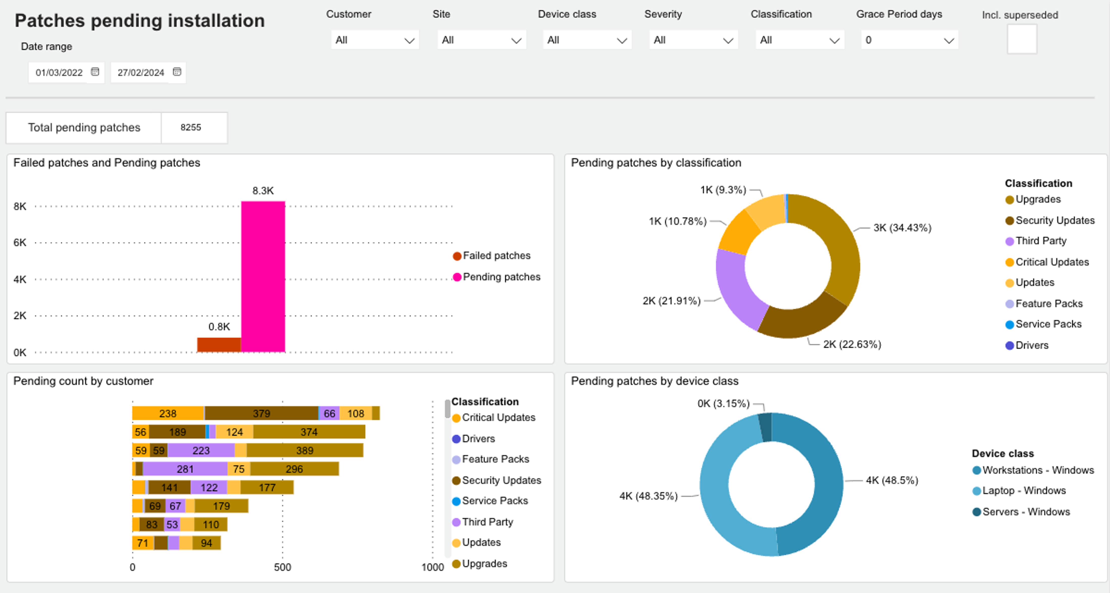 Pending Installation focuses on patches that have been approved and now need to be installed, viewed from different angles. For example, by customer, classification, and device class. By default, Pending Installation is set to show pending patches over the past 31 days, but you can adjust it to show a longer or different time period (depending on Analytics package) by adjusting the date filters, or the status on a given day by setting both date filters to the same date.