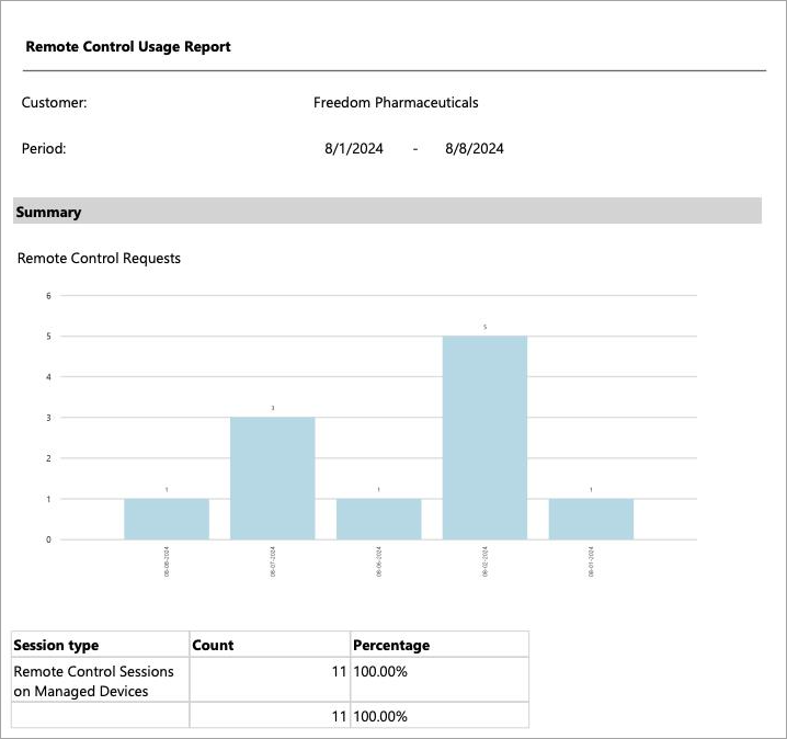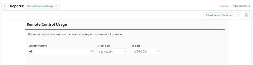 The Remote Control Usage report displays key data related to remote control requests and sessions for devices. The report is often used in IT environments, help desks, or remote support systems to monitor, analyze, and manage remote control activities.