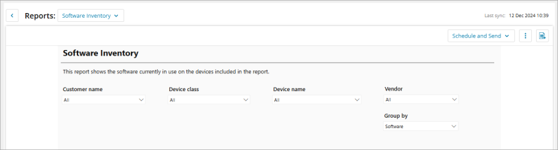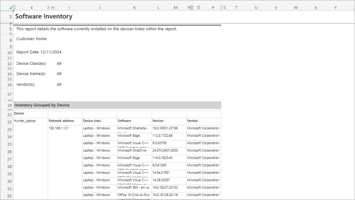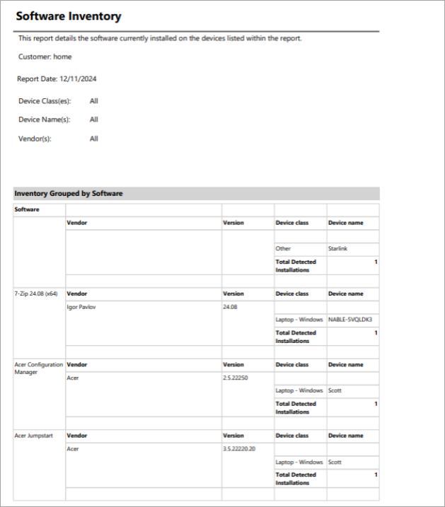 The Software Inventory report provides a comprehensive overview of the software applications currently in use across your customers' devices. It details the specific applications and their versions, ensuring that you or your customers have the latest view of their software inventory. This insight not only supports better software management but also helps identify opportunities for updates, upgrades, or license adjustments.