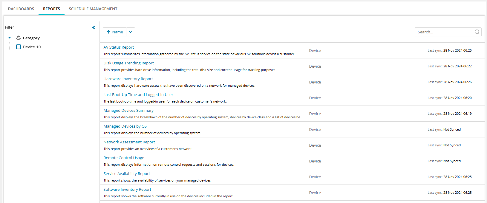 Choose from our built-in or default reports, with more on the way. Filter by clients, sites, devices, or date ranges to get the details you need. Schedule the reports to automatically send them to customers or generate and download them instantly in Excel, CSV, Word, PDF, or PowerPoint format.