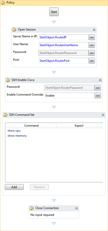 This Automation Policy gets CPU and Memory statistics from a Cisco router.