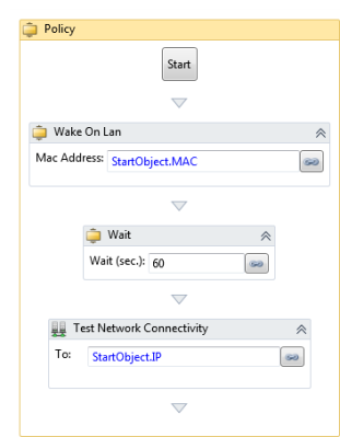 This Automation Policy sends a Wake on LAN special packet to power on the remote device, waits the specified number of seconds, and pings the remote device to test if the power on was successful.
