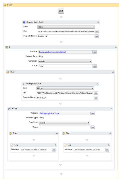 This Automation Policy retrieves the value of the following HKEY_LOCAL_MACHINE\SOFTWARE\Microsoft\Windows\CurrentVersion\Policies\System registry keys to determine if User Access Control is enable or disabled on the remote device: