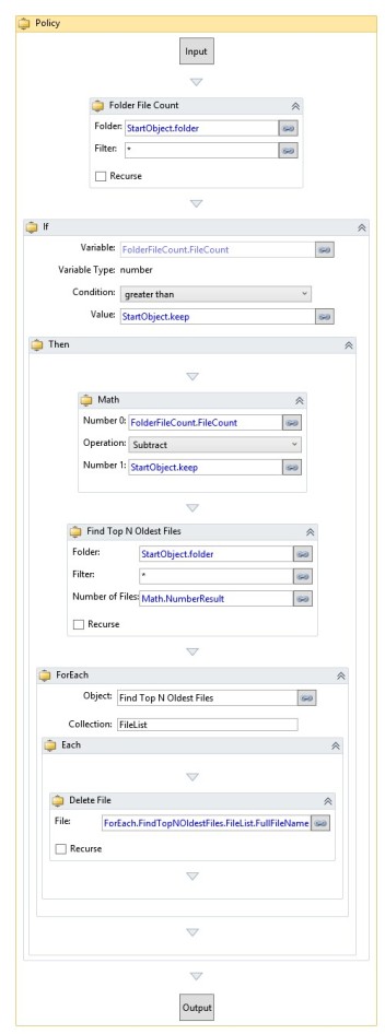 This automation policy deletes the oldest files from a target folder while retaining a configured minimum number of files in the folder. Use this automation policy to manage applications that produce many daily or event-based log files so that those log files do not begin to consume excessive amounts of disk space.
