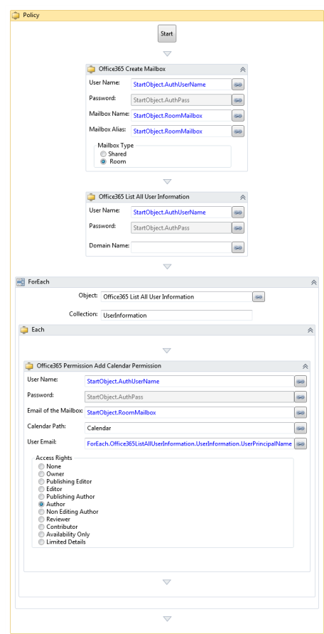 This Automation Policy creates a Microsoft Office 365 shared room mailbox and grant all Office 365 users Author access to the room mailbox calendar.