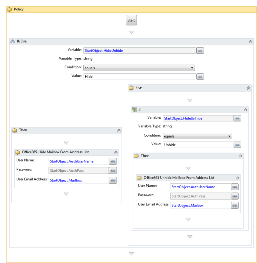 This Automation Policy Hides or Unhides a Microsoft Office 365 mailbox from the address list. Specify Hide or specify Unhide in the "Choose to Hide or Unhide Mailbox" input parameter.