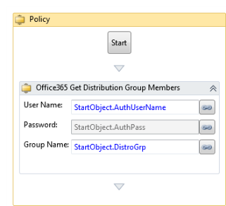 The policy logs into Microsoft Office 365 and gathers the user names for the specified distribution group.