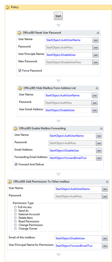 When offboarding an Office 365 User, this Automation Policy resets a user's password, hides user's email address from the global address book, and forwards the user's email to another Microsoft Office 365 user.