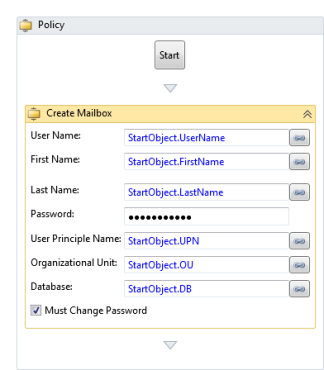 This automation policy creates an AD user and Exchange Mailbox for the specified user. The specified AD user account is created with the password Password!@#. The specified AD user will be prompted to change their account password at next logon. This automation policy must be run on the Exchange Server.