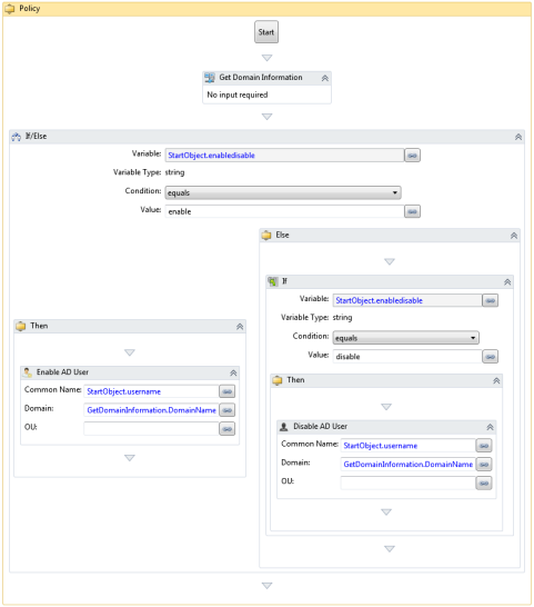 This automation policy enables or disables the specified AD user account. This automation policy must be run on the Domain Controller.