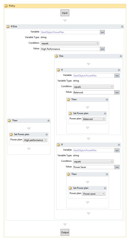 This automation policy configures the Power Plan for target Windows devices to either High Performance, Balanced, or Power Saver.
