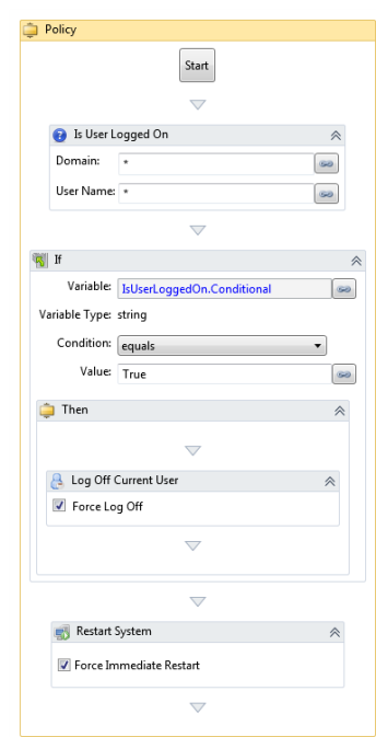 This automation policy restarts the device. If a user is logged on, they are logged off before restarting the device.