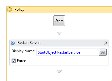 This automation policy restarts a specified Windows service. The force flag is set to "on", which restarts any dependent Windows Services as well.