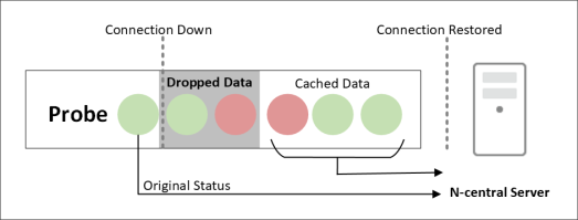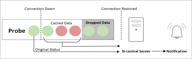 During the time that the connection between the probe and N-able N-central is down, the status of the monitored services appear as stale. Once the connection to the N-able N-central server is restored, the probe transfers the cached data to N-able N-central. N-able N-central compares the most recent information in the cached data to the original data before the connection went down to determine if the service status has changed. If there is a change, the new service status appear on the dashboards and N-able N-central triggers the appropriate notifications.