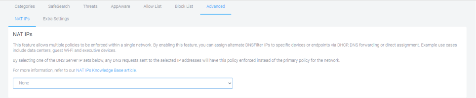 NAT IPs - Allow you to enforce multiple policies within a single network. By enabling this feature, you can assign alternate DNS Filtering IPs to specific devices or endpoints through DHCP, DNS forwarding, or direct assignment. For example, data centers, guest Wi-Fi, and executive devices.