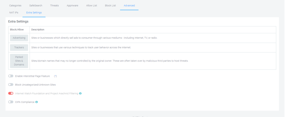 Extra Settings - The extra settings tab allows you to configure DNSFilter beta features. The settings are experimental and at the forefront of new developments in DNSFilter platform.