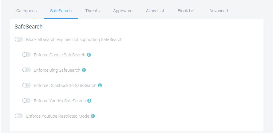 This category offers Google, Bing, and YouTube SafeSearch options. You cannot override SafeSearch if the SafeSearch options are enabled in your filtering policy. Enabling the SafeSearch options in a filter overrides any blocking for the affected sites that would normally be blocked by the "Search Engines & Portals" category. If you want to ensure that Google, Bing, etc are blocked, disable the SafeSearch toggle(s) in the filter. The same applies to YouTube which is normally blocked by the "Entertainment" category.