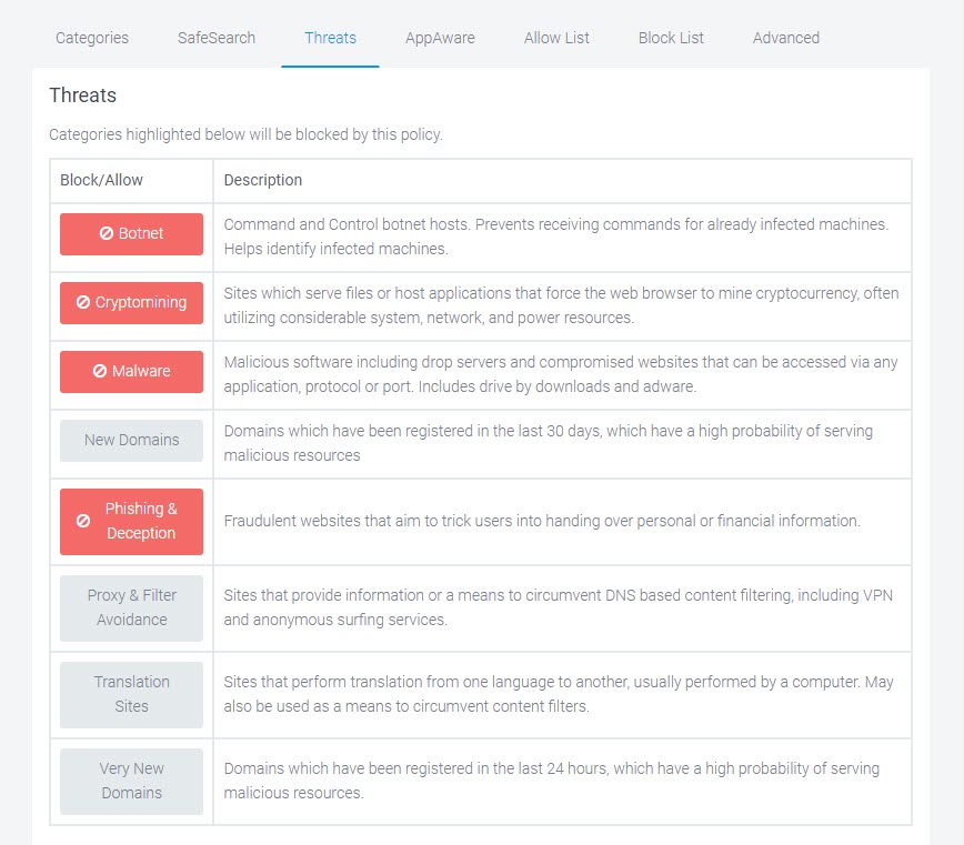 Block entire threat categories such as phishing, malware, and botnets.