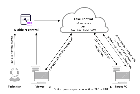 Take Control does not have access to session content. All encryption is based on an end-to-end negotiation that does not intercept transferred information or decode the information in the gateway. Encryption keys are randomly generated for each session.