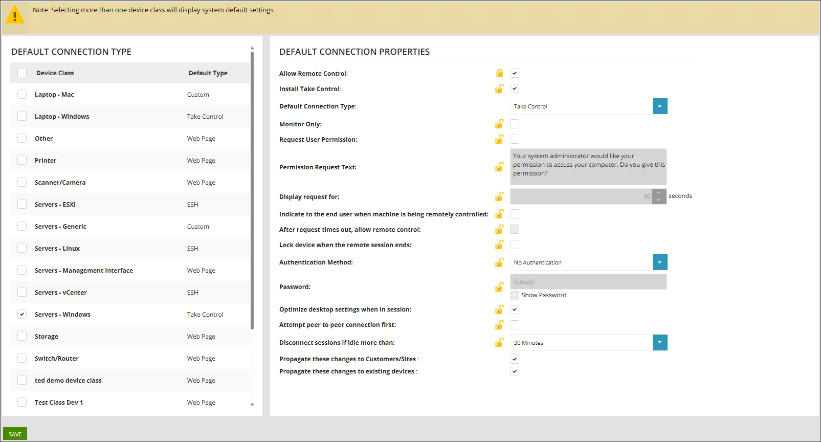 You can configure Take Control settings for all devices in specific device class(es) from the Service Organisation (SO) or Customer/Site level, instead of configuring each device individually.