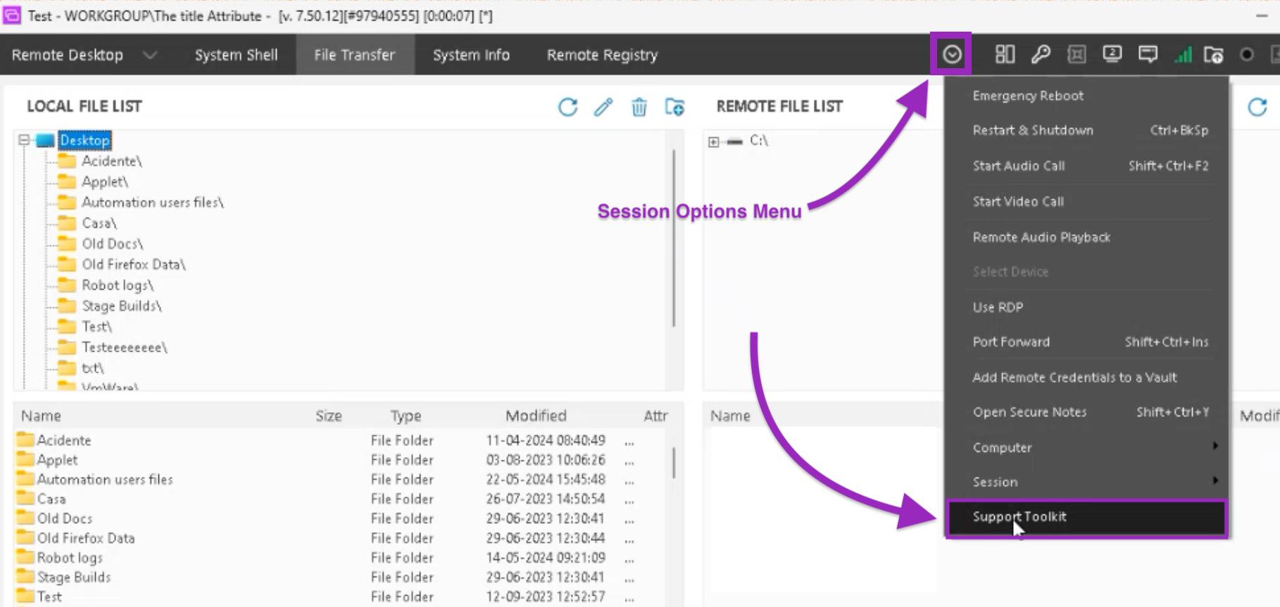 During a support session, navigate to the Session Options menu of the Remote Viewer.