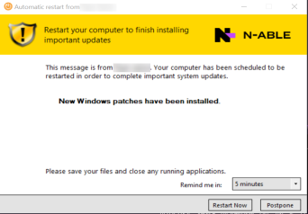 - The period the maintenance window should last for is largely dependent on if you want the user to delay the reboot. A longer maintenance window is required if you want a longer countdown period. When you enable the user to delay the patch reboot, N-able N-central displays a message on the user's device, as well as the ability to delay the reboot.