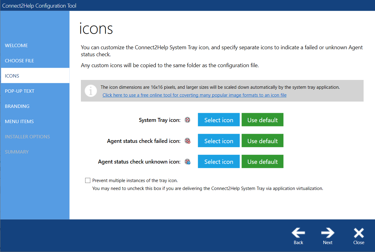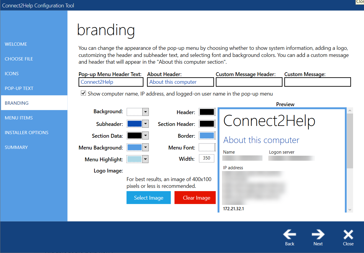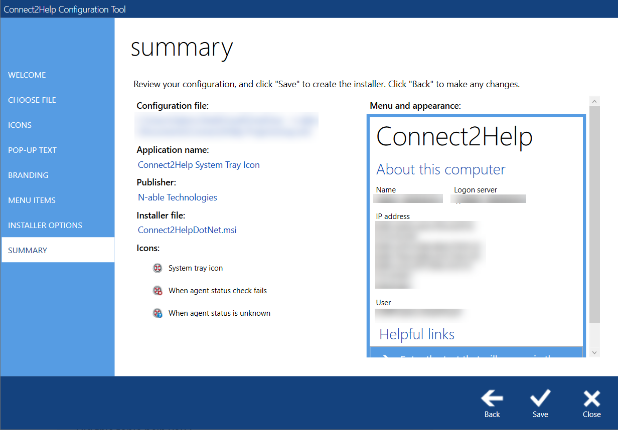 Customize the installation software to prepare to deploy the Connect2Help tray tool. Use the three icons you created to create the custom tray tool package. The Connect2Help System Tray Icon uses an XML file to store custom settings including tooltips, icons and menu items to open web pages in a browser, email with preset recipients or text.