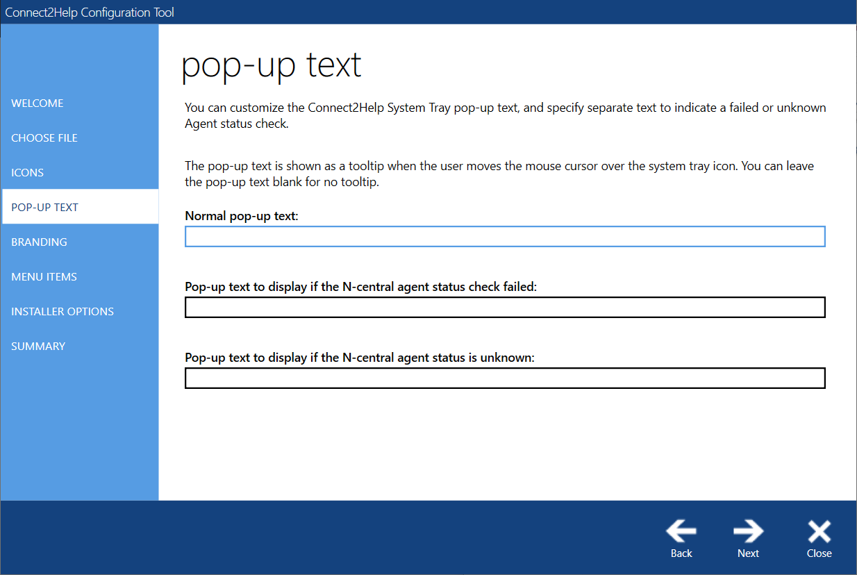 In the Pop-Up Text tab, enter the pop-up texts that appears as a status in the System Tray.