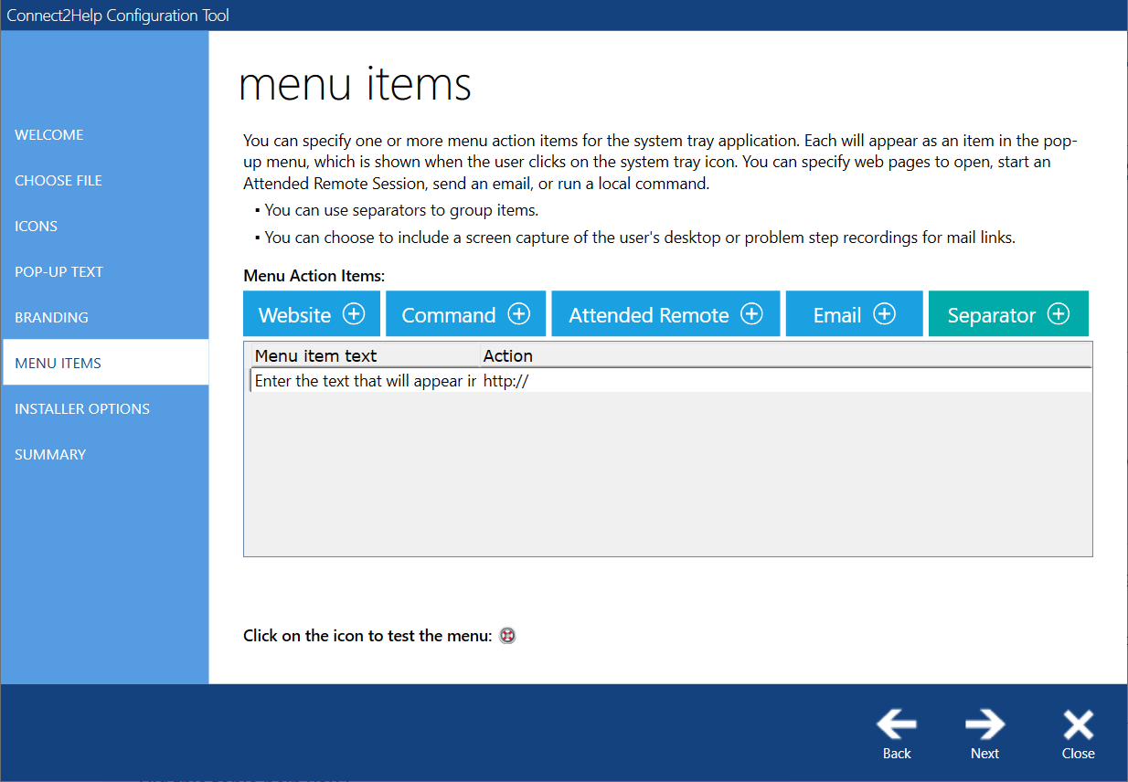 In the Menu Items tab, configure the customizable menu that appears when a user accesses the Connect2Help Tray Tool: