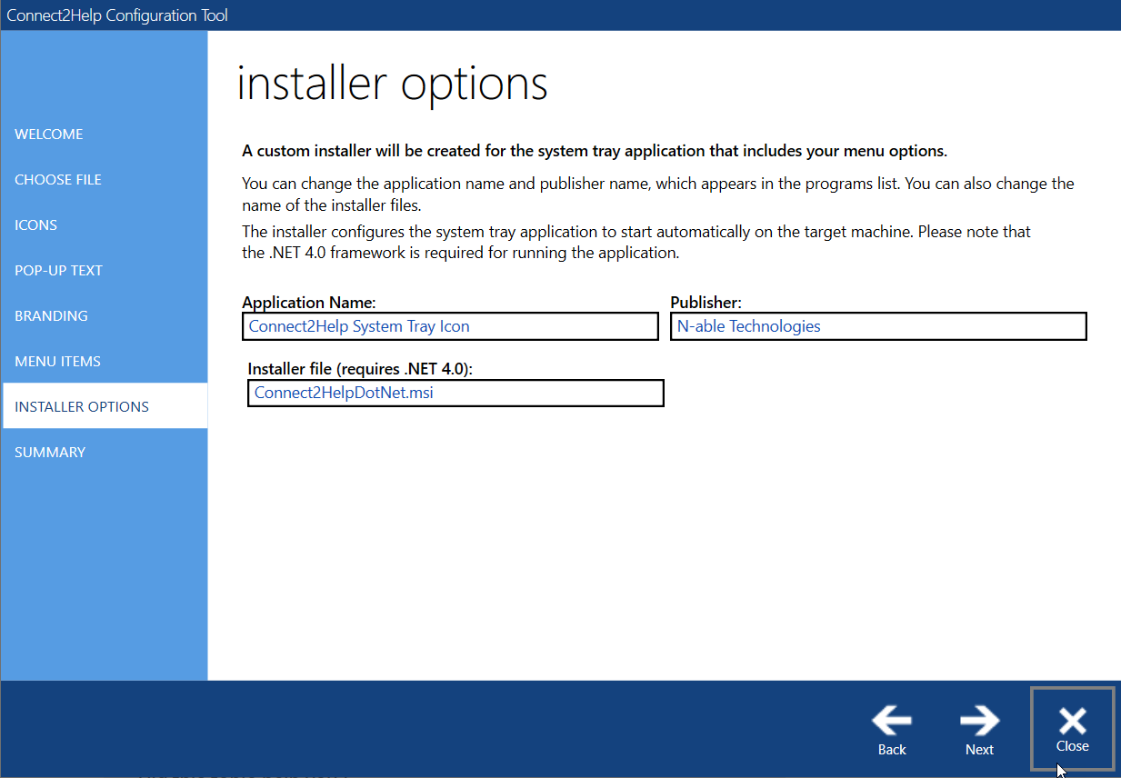 - In the Installer Options tab, enter an Application Name for the tray tool, Publisher and file name for the installer.