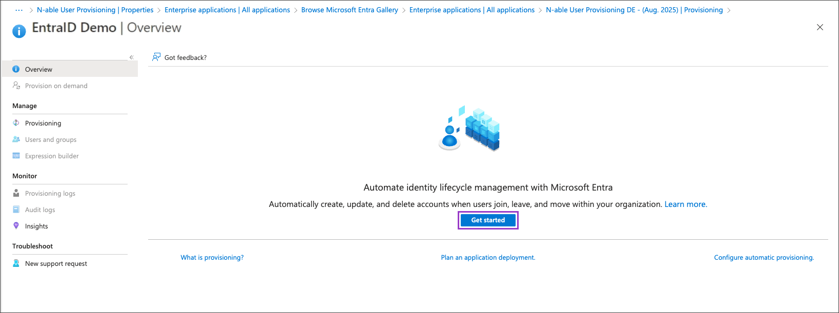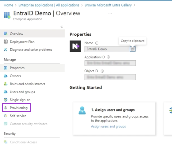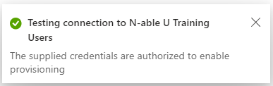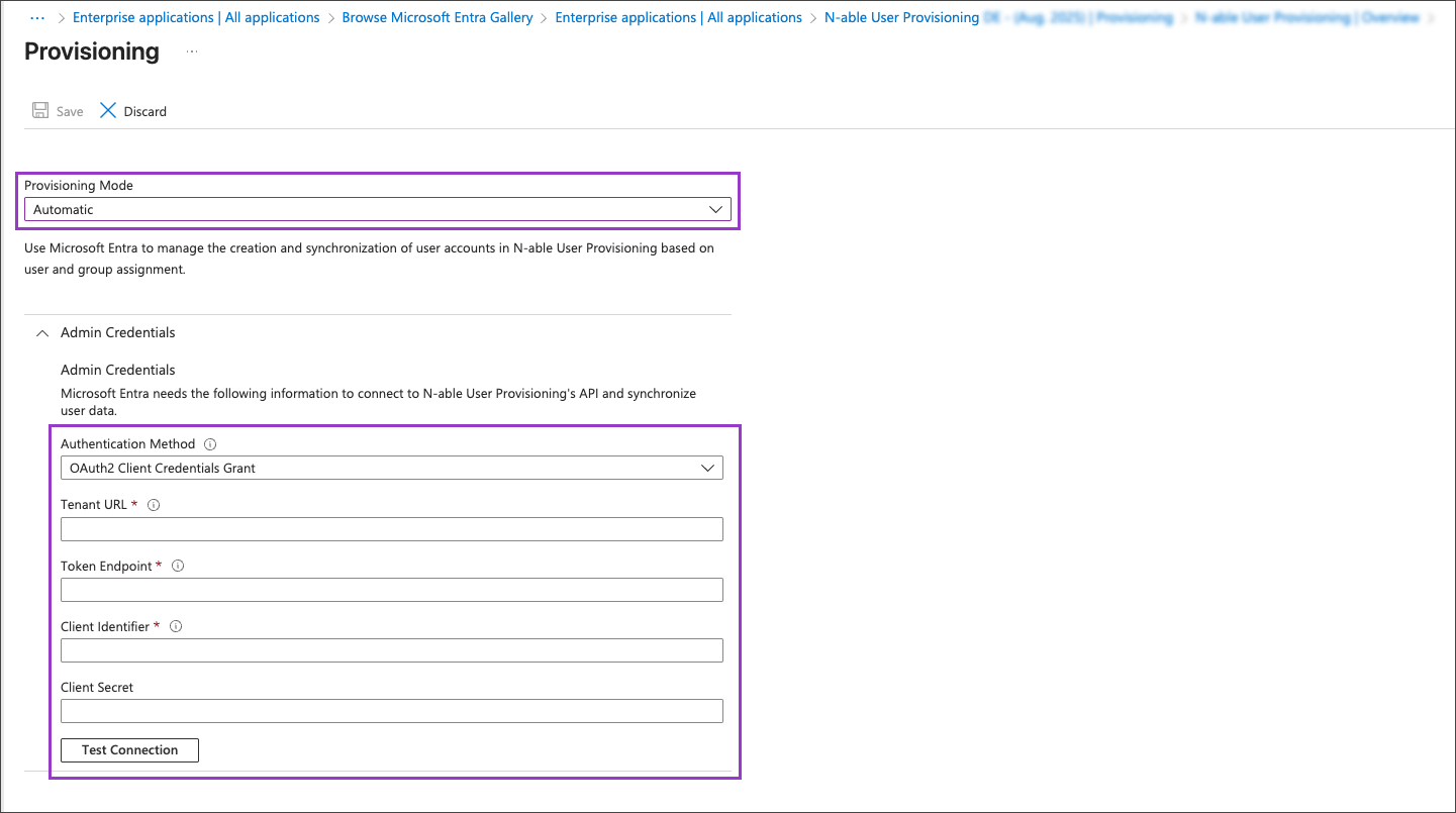- Change "Provisioning Mode" to Automatic and enter the credential information that you copied to the clipboard when you Set up N-able Login with Entra ID as an IdP. This is the Tenant URL, Client Identifier, Client Secret, and Token Endpoint.