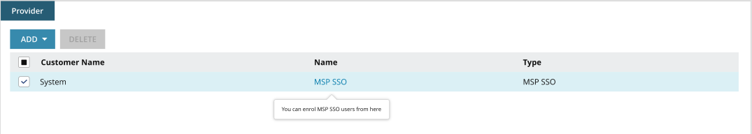 From the LINK TO SSO PROVIDER menu, select MSP SSO. If on an onprem system, select SYSTEM MSP SSO.