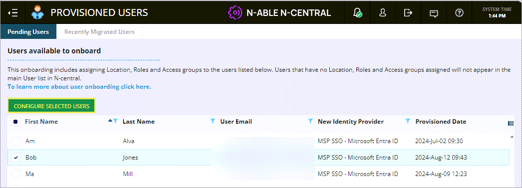 - From the Pending Users tab, select the users to onboard and click Configure Selected Users.