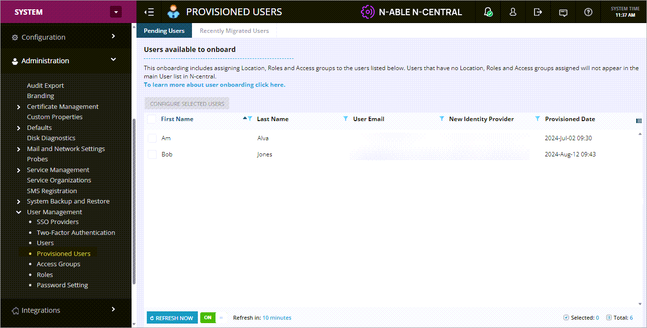 - Recently Migrated Users (read only): Users who already had an N-central account with assigned roles and access groups were migrated to Entra ID for authentication when they were added to the Entra enterprise application.