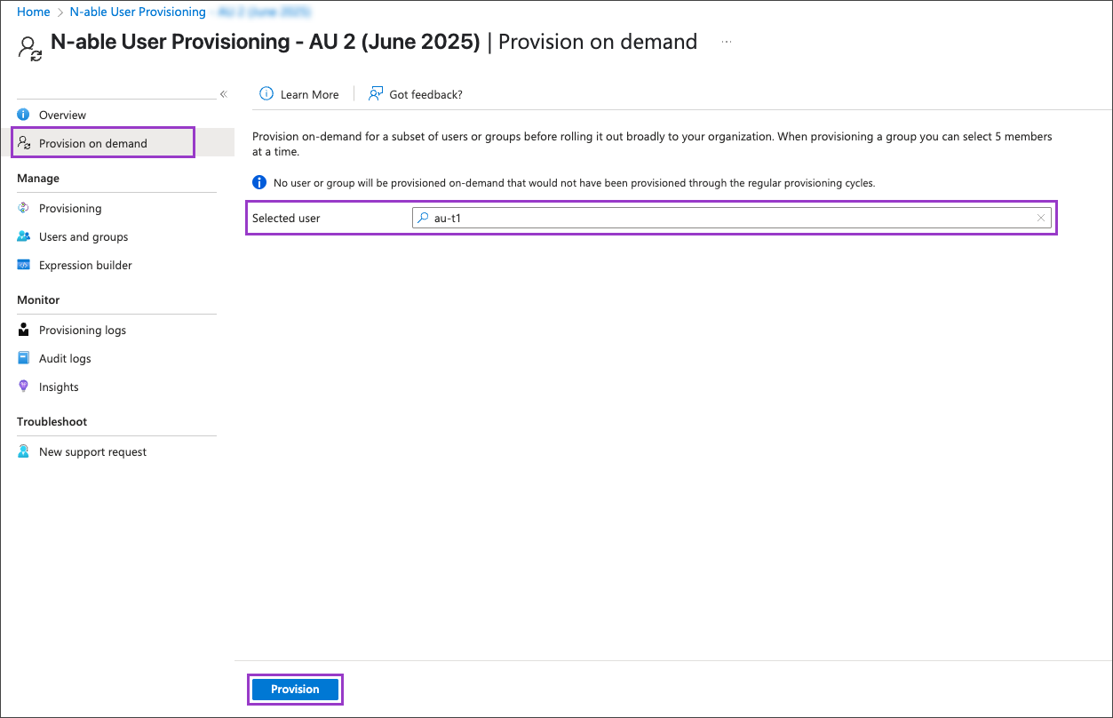 As Microsoft advises that user provisioning through Entra ID auto-provisioning may take up to 40 minutes to complete, you may wish to use the "Provision on demand" option to have one or more users provisioned sooner.