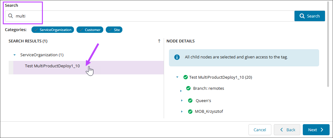 Enter a search string to find a node (service organization, customer, or site), then select Search.