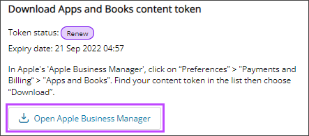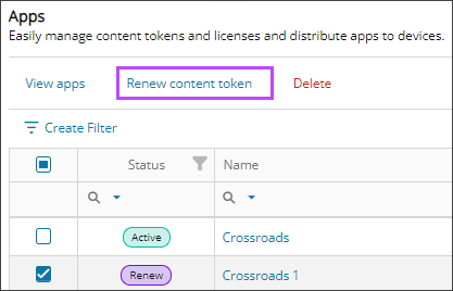 Apple content tokens (formerly server tokens) expire annually. When you add a content token for a customer, the expiry date displays in the Apps tab. You must renew content tokens to avoid interruption of service.