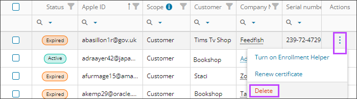 3. For the certificate you want to delete, use the action menu to select Delete.