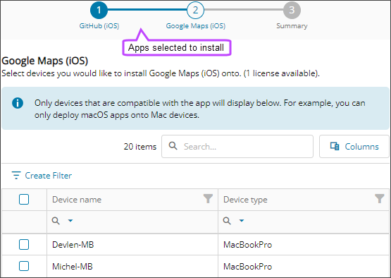 - Select the devices where you want to install the app, and select Next (repeat for all selected apps).
