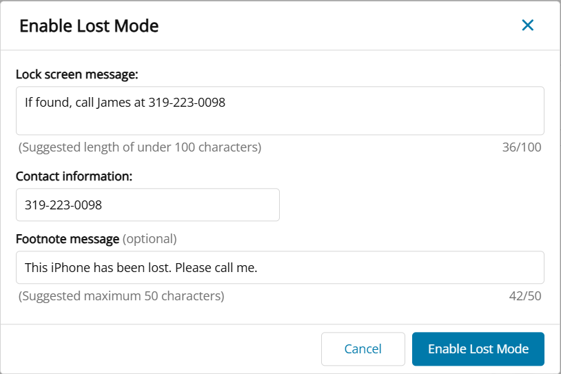 This information cannot be changed once the Lost Mode activation session is sent, so make sure the information is correct the first time.