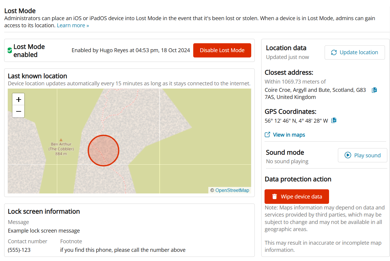 Administrators can activate Managed Lost Mode on an iOS or iPadOS device if it is lost or stolen. In Managed Lost Mode, admins have the ability to request the device's location and trigger it to play a sound.