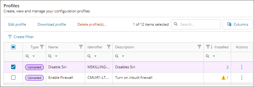 3. Filter or search to find the profiles you want and select the checkbox for each profile. You can only edit or download one profile at a time, but you can delete more than one profile at a time.