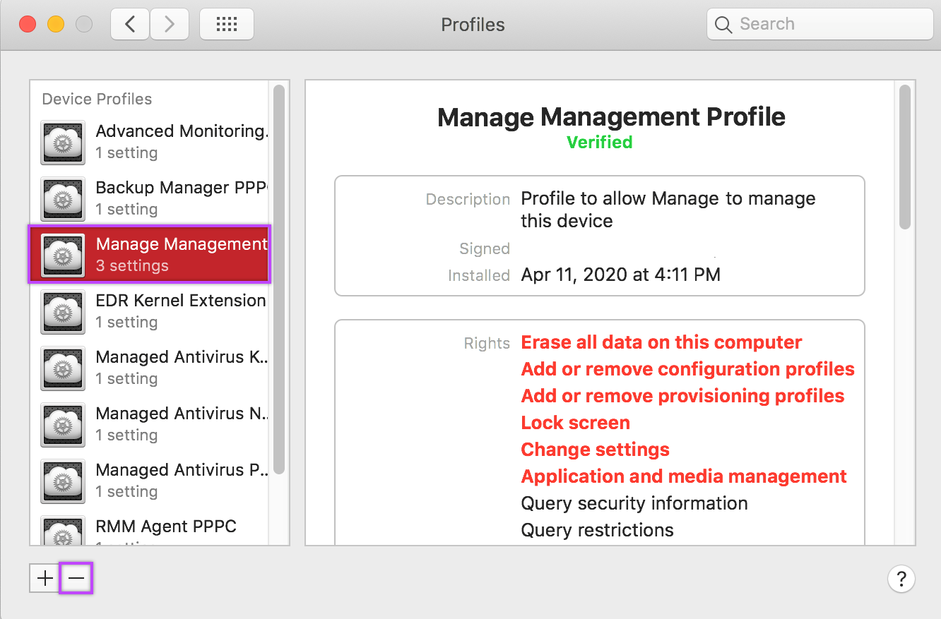 To perform a clean manual enrollment profile removal on macOS devices running Device Management for Apple, we recommend you first uninstall the Mac Agent and then delete the enrollment profile from the device.