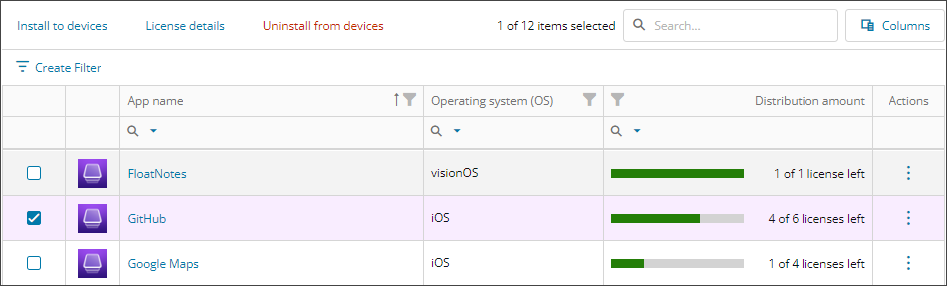 The license details for the app display showing the devices that have the app installed or an app status related to the app.