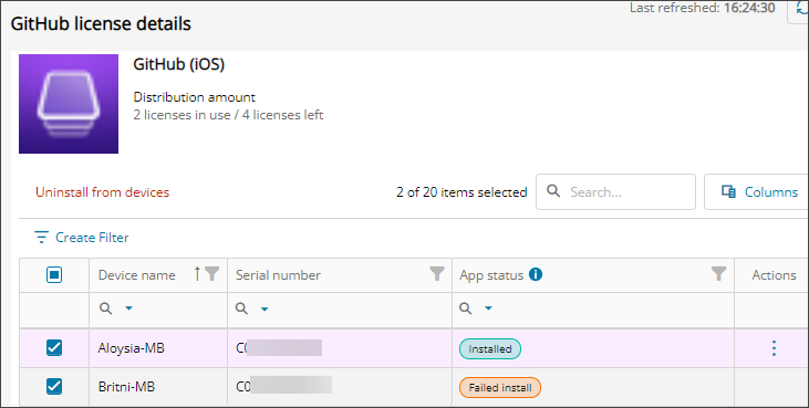 For each customer, you can view the license details for every app they purchased from Apple Business Manager. The details include the app name and serial number, the status of the app, and the number of licenses available.